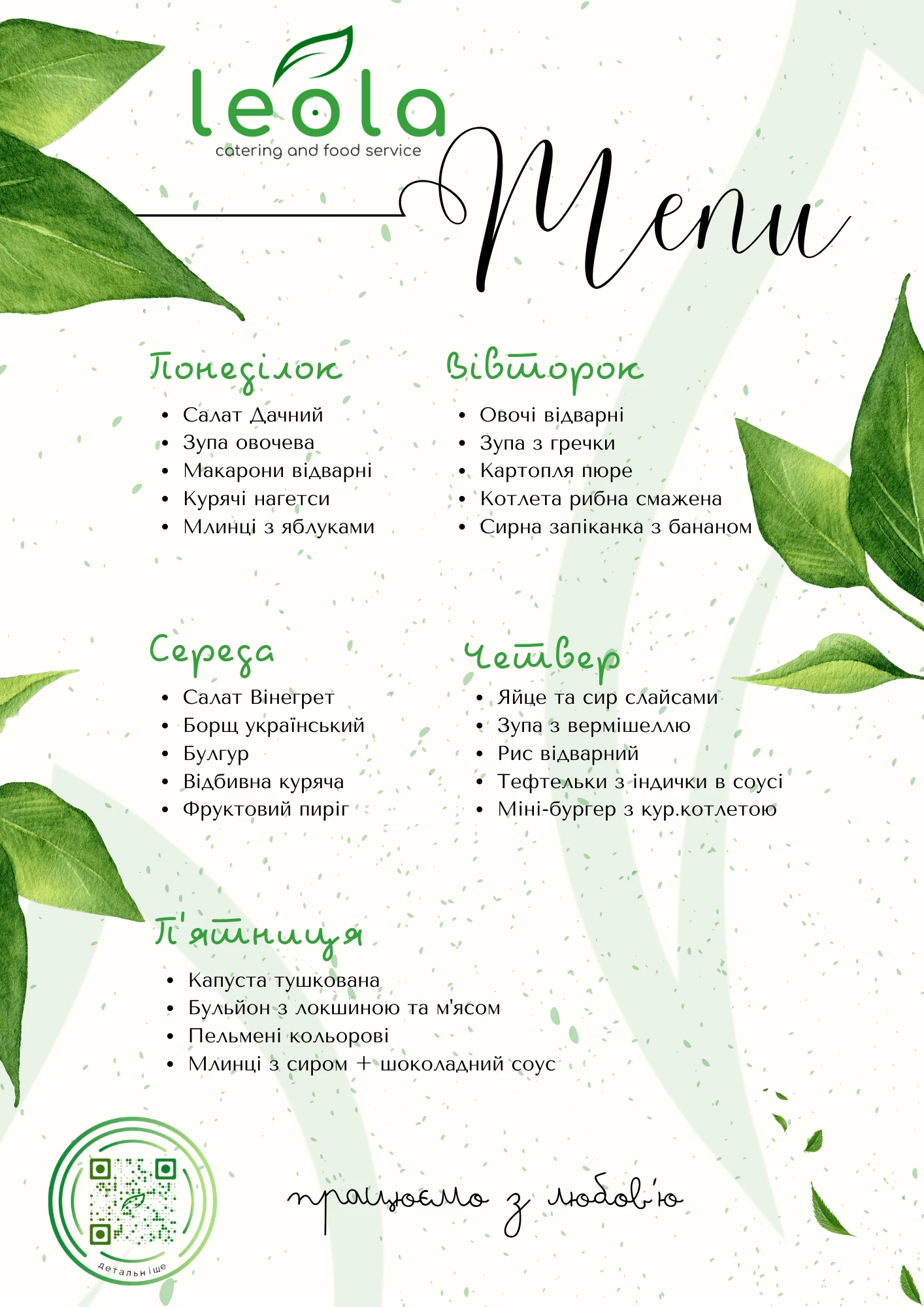 LeOla пропонує широкий вибір страв та гнучкі умови співпраці. Ми готові адаптуватися до ваших потреб та побажань